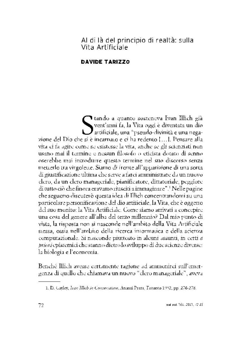 Davide Tarizzo, Al di là del principio di realtà: sulla Vita artificiale, aut aut, 361, 2013, 72-81.