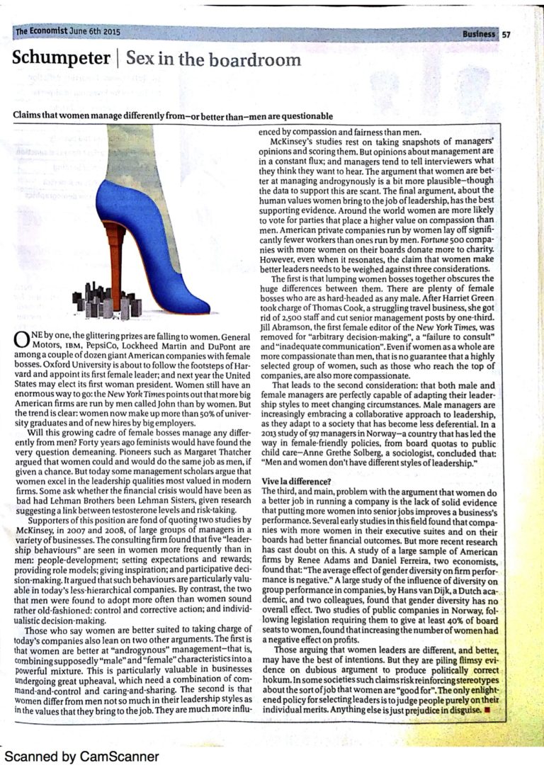 In un articolo intitolato Sex in the boardroom (Sesso nella sala di comando), l’Economist si interroga su alcuni studi (McKinsey 2007 e 2008) secondo i quali le donne avrebbero una propensione ad uno stile di leadership particolarmente adatto alle aziende moderne, che sono poco gerarchizzate ed attuano modelli decisionali partecipativi, attenzione alla crescita professionale dei lavoratori e al loro coinvolgimento. Coloro che sostengono che le donne sarebbero più adatte a gestire le aziende moderne sottolineano come le donne manager siano capaci di combinare caratteristiche di management maschili (di cui non mancano) e femminili a seconda delle necessità.
